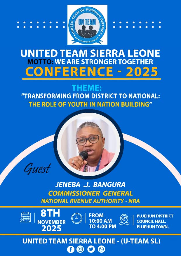 U Team SL Conference – Saturday, November 8th, 2025: The Commissioner General of the National Revenue Authority (NRA), Madam Jeneba J. Bangura, graced the United Team Sierra Leone (U Team SL) Conference held on November 8th 2025 in Pujehun District under the theme: “Transforming From District to National – The Role of Youth in Nation Building.” Her presence at the landmark event underscored the importance of institutional leadership in advancing grassroots-driven development and empowering Sierra Leone’s youth.